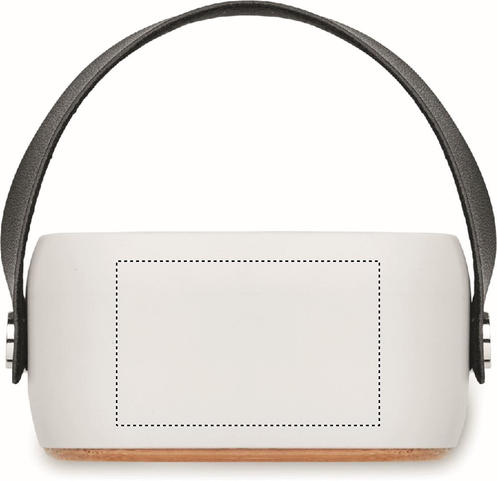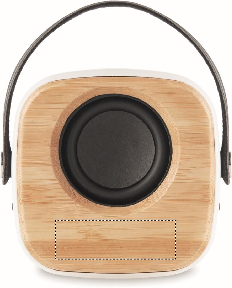 Trådlös högtalare i ABS med bambu front och PU-rem. Uppladdningsbart Li-ION 500 mAh batteri. Utdata: 3W och 4 Ohm. Speltid ca. 4 timmar.