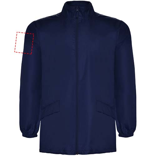 Vattentät regnjacka. Hög krage och vikbar huva med justerbar dragsnodd. Dragkedja framtill med matchande löpare. Två sidfickor med lock. Elastiska muddar. Elastiskt snöre inuti fickan för vikning och förvaring. Vattentät modell. Modellen är 185 cm och bär storlek L.