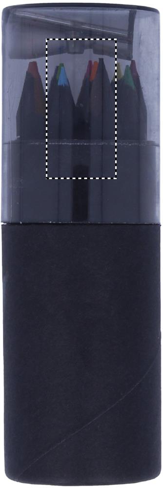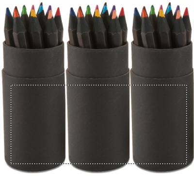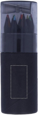 Svart Pennset med 12 färgade blyertspennor med en pennvässare i locket på asken.