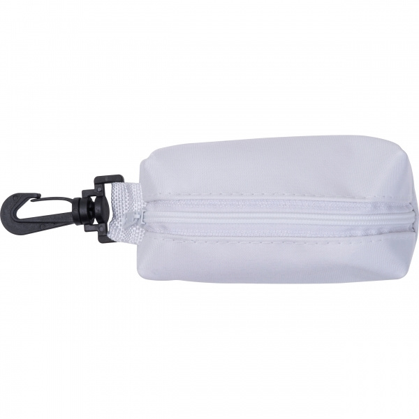 Polyesterpåse med dragkedja, karbinhake i plast och åtta olika färgpennor. Din logotyp är tryckt på påsen.