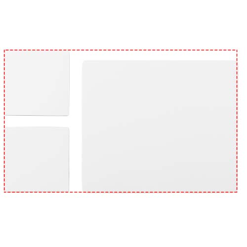 Q-Mat® Set 3 med musmatta och underlägg. Setet består av en Q-mat-musmatta och två matchande underlägg med ditt företags design. Setet består av en rektangulär musmatta (0,3 x 23,5 x 20 cm) och två kvadratiska underlägg (0,3 x 9,8 x 9,8 cm). EVA-skum med laminerat papper .