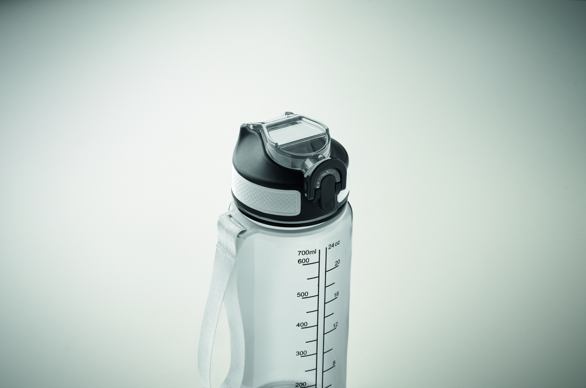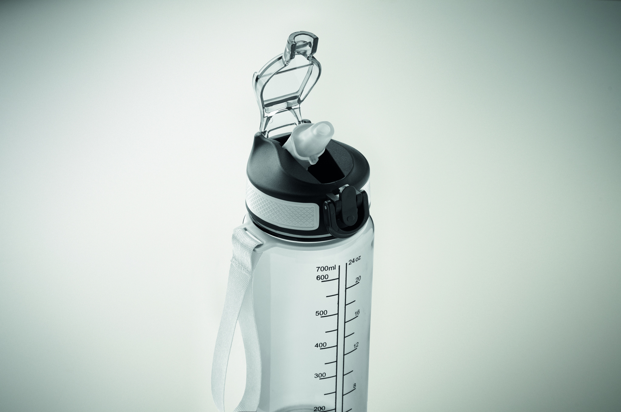 Motiverande sportvattenflaska i RPET med integrerat sugrör, munstycke i mjuk silikon, fliptop-lock som kan öppnas med en hand, säkerhetslås. Med bärrem i RPET satin. Volym 700 ml. Läckagefri.